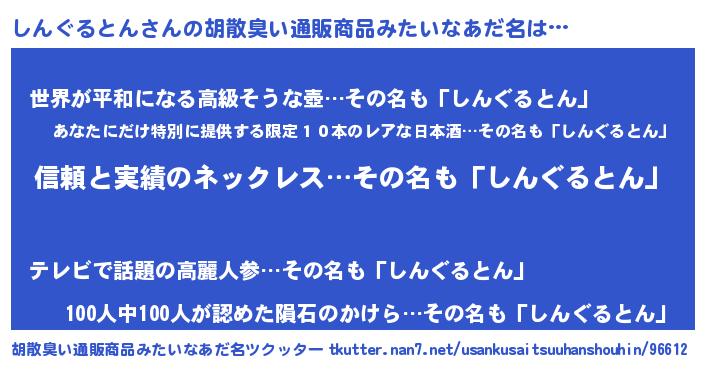 | 意味不明あだ名 | 『とにかく怪しいしんぐるとん』 |