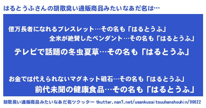 | 男性向けラノベタイトル風あだ名 | 『はたらくはるとうふさま!』 |