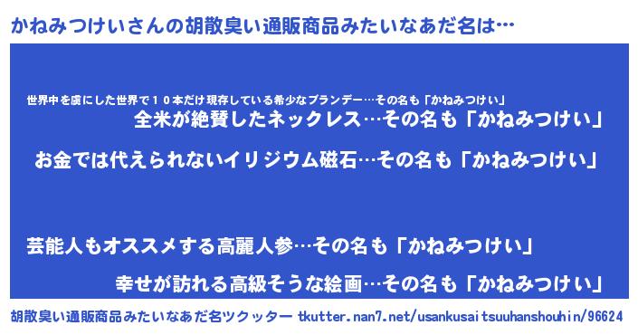 | 男性向けラノベタイトル風あだ名 | 『かねみつけいに滅ぼされるだけの簡単なお仕事です』 |