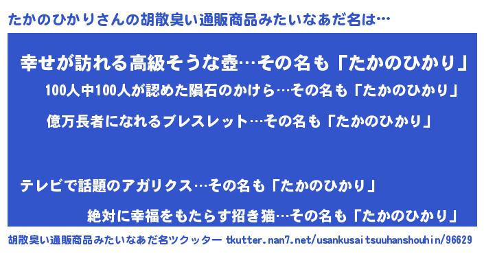 | 男性向けラノベタイトル風あだ名 | 『たかのひかり~年齢イコール彼女いない歴の魔法使い~』 |