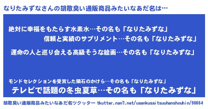 | 男性向けラノベタイトル風あだ名 | 『なりたみずな~年齢イコール彼女いない歴の魔法使い~』 |
