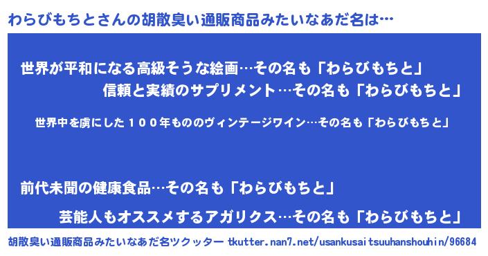 | 意味不明あだ名 | 『住所不定無職わらびもちと(12歳)』 |