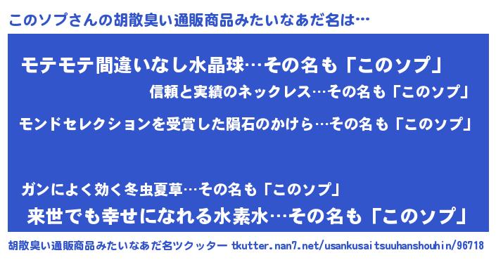 | 男性向けラノベタイトル風あだ名 | 『このソプに滅ぼされるだけの簡単なお仕事です』 |