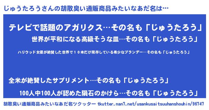 | 恥ずかしいあだ名 | 『ジュウタロウデラックス』『じゅっちょ』 |