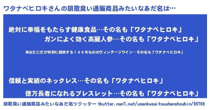| ヘコむあだ名 | 『ワタナベヒロキ(笑)』『ワタふぇ~』 |