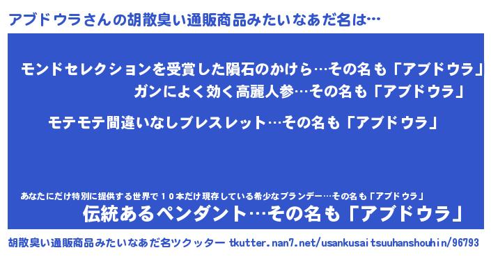 | 男性向けラノベタイトル風あだ名 | 『アブドウラアートオンライン』 |