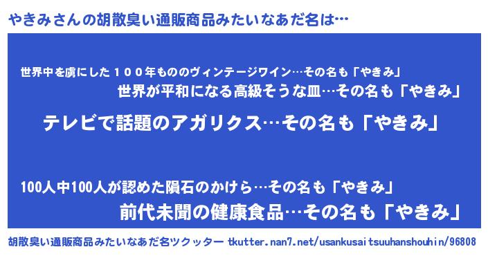 | 男性向けラノベタイトル風あだ名 | 『Re:やきみから始める異世界生活』 |