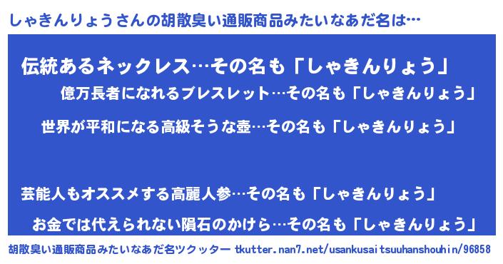 | 意味不明あだ名 | 『しゃきんりょうフォーエバー』 |