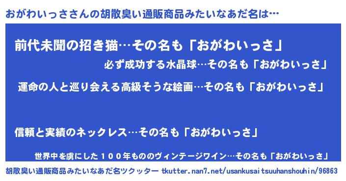 | 欧米人風あだ名 | 『トリンドルおがわいっさ』 |