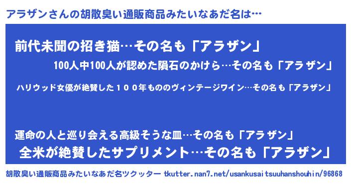 | 意味不明あだ名 | 『住所不定無職アラザン(12歳)』 |