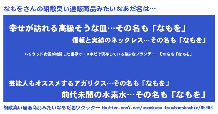 | 意味不明あだ名 | 『住所不定無職なもを(98歳)』『自称なもを』 |
