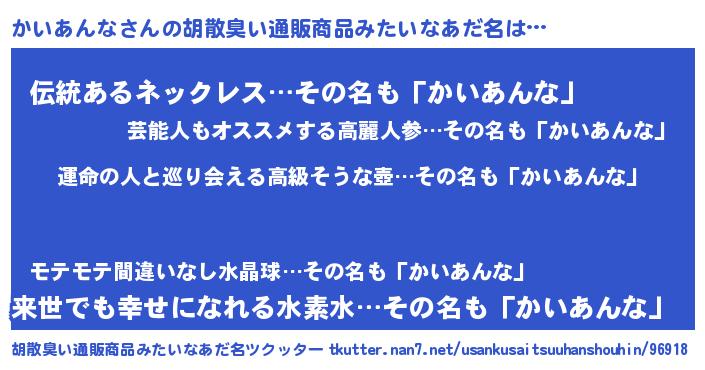 | 女子向けラノベタイトル風あだ名 | 『かいあんなの婚約者』『闇のかいあんな』 |
