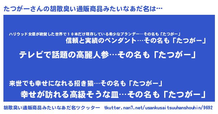 | 男性向けラノベタイトル風あだ名 | 『転生したらたつがーだった件』 |