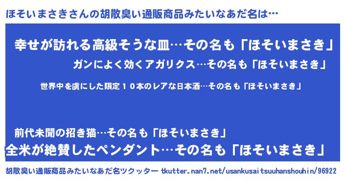 | 意味不明あだ名 | 『住所不定無職ほそいまさき(62歳)』 |