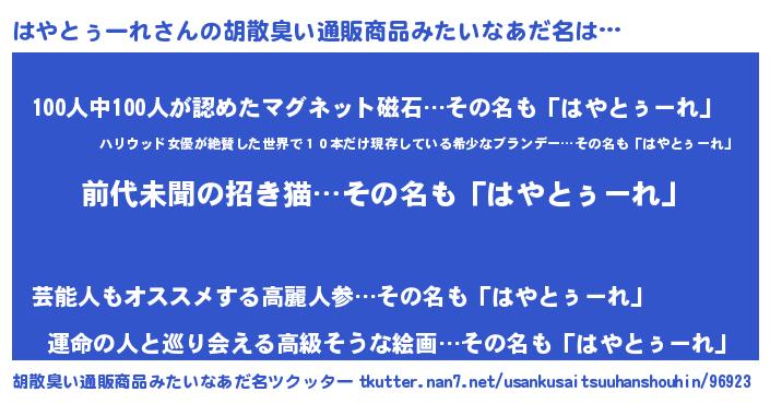 | 男性向けラノベタイトル風あだ名 | 『はやとぅーれ~年齢イコール彼女いない歴の魔法使い~』 |