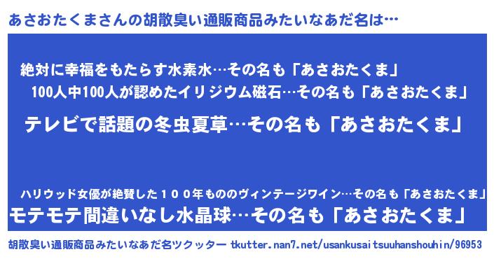 | ヘコむあだ名 | 『あさおたくま(遠い目)』『あさっふぃ~』 |