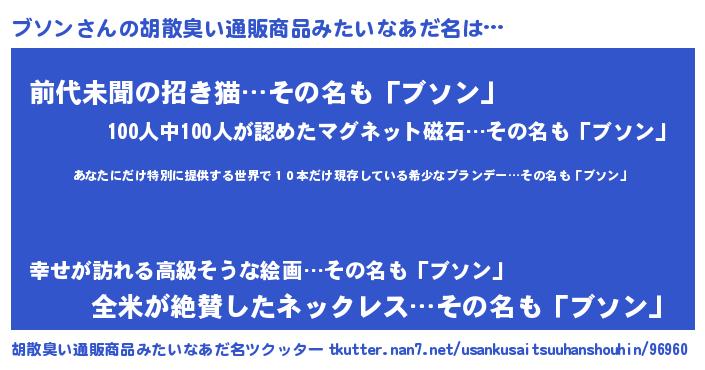 | 意味不明あだ名 | 『住所不定無職ブソン(84歳)』 |