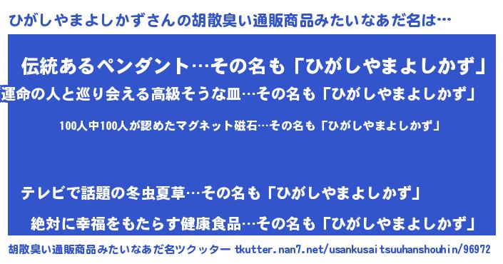 | 男性向けラノベタイトル風あだ名 | 『おまえをオタクにしてやるから、俺をひがしやまよしかずにしてくれ! 』 |
