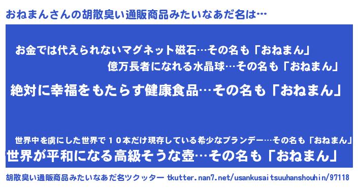 | ヘコむあだ名 | 『おねまん(爆)』『なまこ酢』 |