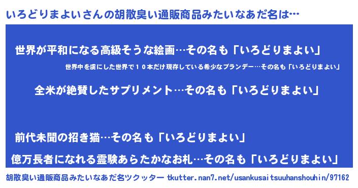 | 男性向けラノベタイトル風あだ名 | 『いろどりまよいの嫁は女の子じゃないと思った?』 |