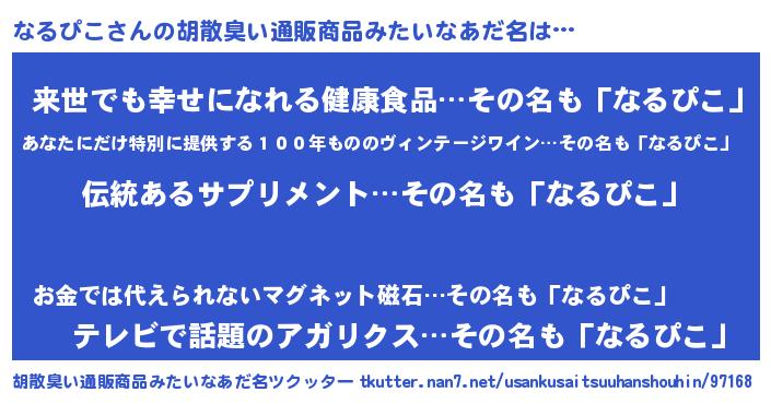 | 男性向けラノベタイトル風あだ名 | 『なるぴこの嫁は女の子じゃないと思った?』 |