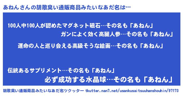 | 女子向けラノベタイトル風あだ名 | 『あねんの婚約者』『死神あねんの再婚』 |