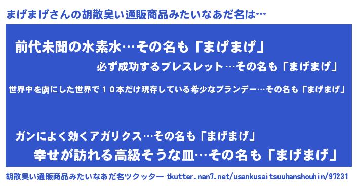 | 意味不明あだ名 | 『住所不定無職まげまげ(79歳)』 |