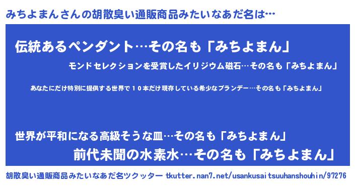 | 男性向けラノベタイトル風あだ名 | 『みちよまん~年齢イコール彼女いない歴の魔法使い~』 |