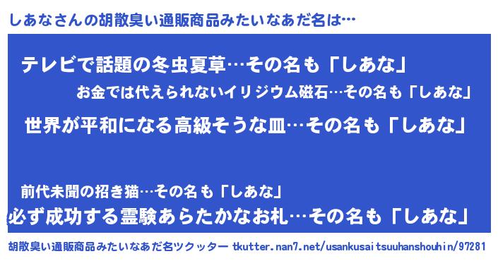 | 意味不明あだ名 | 『しあなフォーエバー』『自称しあな』 |