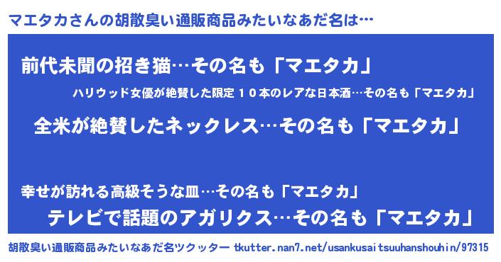 | 意味不明あだ名 | 『とにかく怪しいマエタカ』 |