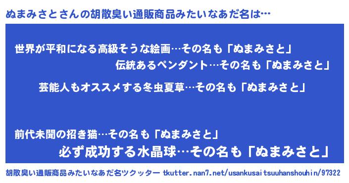 | 男性向けラノベタイトル風あだ名 | 『ぬまみさと~年齢イコール彼女いない歴の魔法使い~』 |