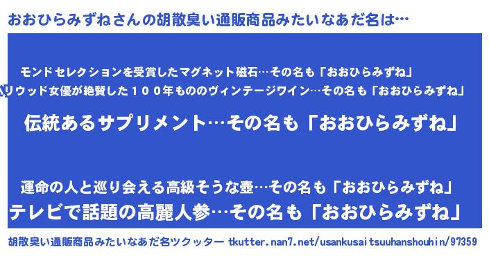 | 男性向けラノベタイトル風あだ名 | 『ダンジョンにおおひらみずねを求めるのは間違っているだろうか』 |