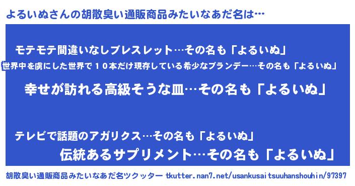 | 男性向けラノベタイトル風あだ名 | 『緋弾のヨルイヌ』『よるいぬの憂鬱』 |