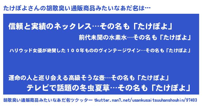 | 意味不明あだ名 | 『住所不定無職たけぽよ(12歳)』 |