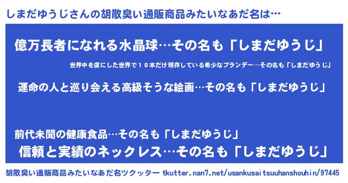 | 恥ずかしいあだ名 | 『しまっちょ』『プリティーしまだゆうじ』 |