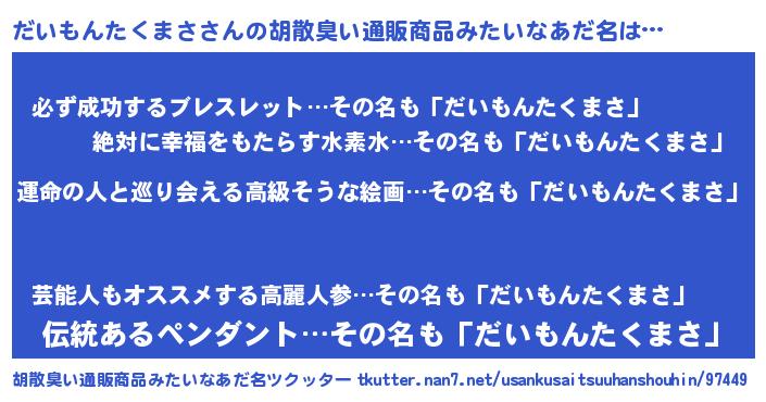 | 肩書あだ名 | 『だいもんたくまさ総理大臣』 |