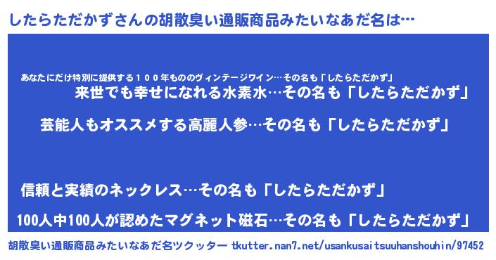 | ヘコむあだ名 | 『したらただかず(小並感)』『したっ子』 |