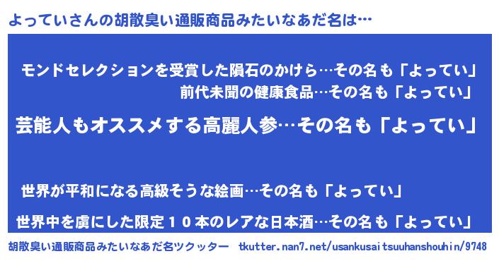 | 意味不明あだ名 | 『自称よってい』『ヨモギ科よってい属』 |