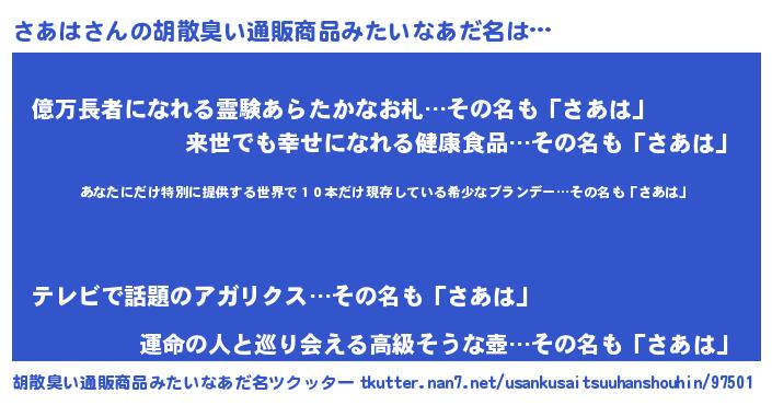 | 意味不明あだ名 | 『住所不定無職さあは(81歳)』『自称さあは』 |