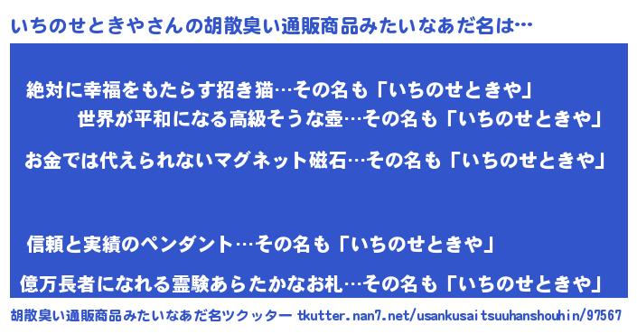 | ヘコむあだ名 | 『いちのせときや(小並感)』『いちふぇ~』 |