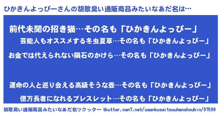 | ヘコむあだ名 | 『ひかきんよっぴー(震え声)』『ひかふぇ~』 |