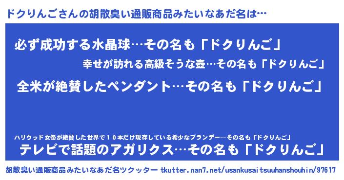 | 男性向けラノベタイトル風あだ名 | 『ドクりんごの嫁は女の子じゃないと思った?』 |