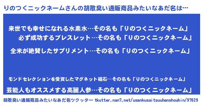 | 男性向けラノベタイトル風あだ名 | 『りのつくニックネーム~年齢イコール彼女いない歴の魔法使い~』 |