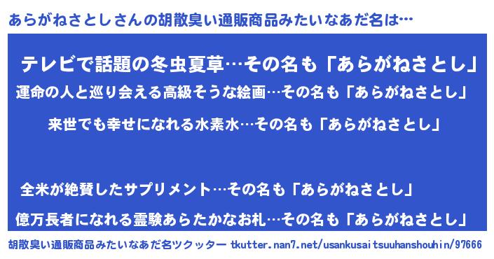 | ヘコむあだ名 | 『あらがねさとし(遠い目)』『あらにゅー』 |