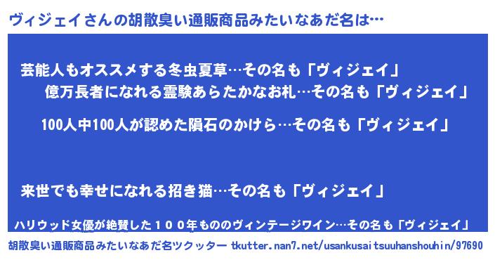 | 男性向けラノベタイトル風あだ名 | 『おまえをオタクにしてやるから、俺をヴィジェイにしてくれ! 』 |
