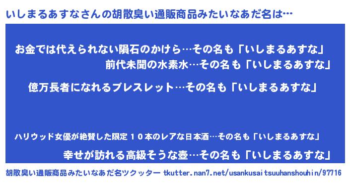 | ヘコむあだ名 | 『いしにー』『なまこ酢』『いしお』 |