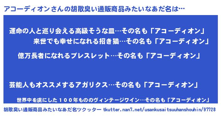 | 男性向けラノベタイトル風あだ名 | 『アコーディオンアートオンライン』 |