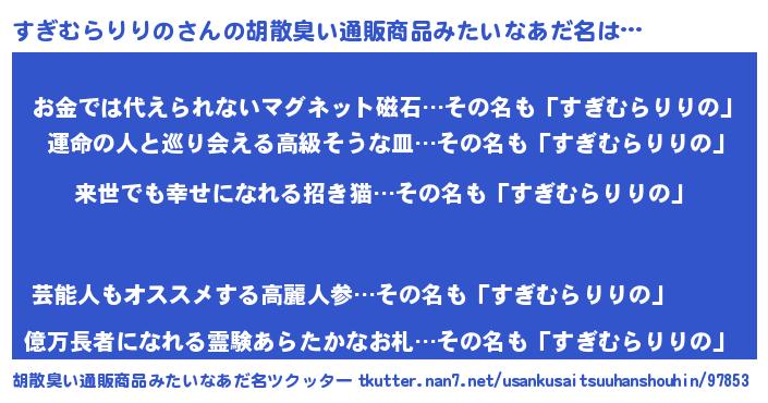 | ヘコむあだ名 | 『すぎむらりりの(笑)』『すぎもー』 |
