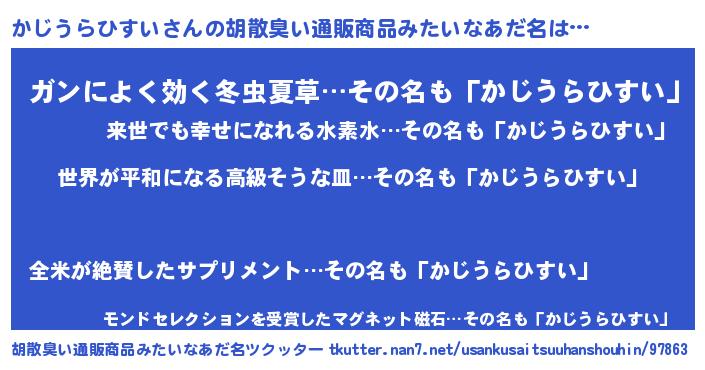 | 男性向けラノベタイトル風あだ名 | 『かじうらひすいに滅ぼされるだけの簡単なお仕事です』 |