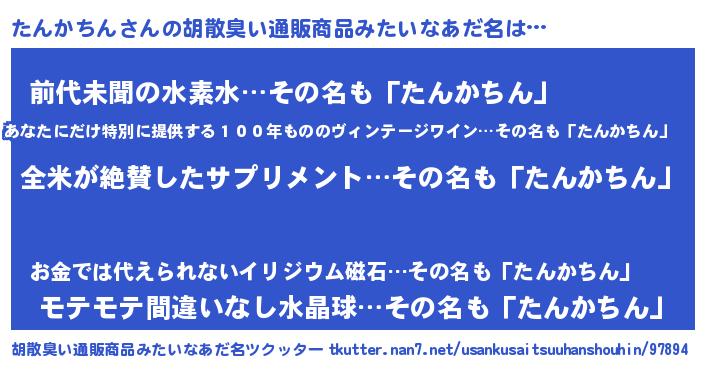 | 男性向けラノベタイトル風あだ名 | 『たんかちんの嫁は女の子じゃないと思った?』 |